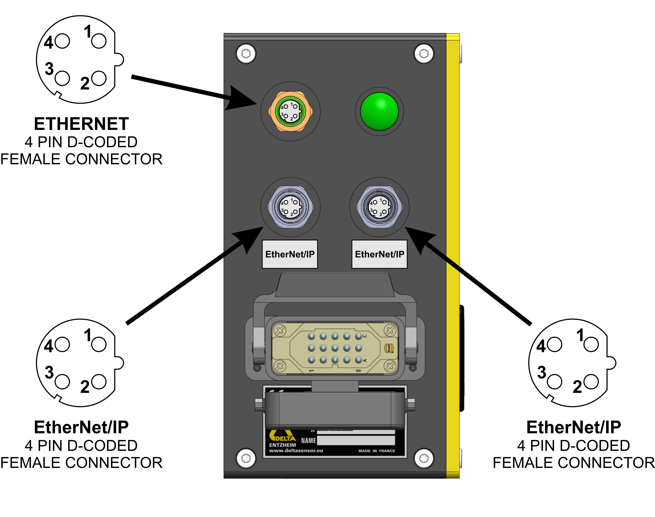 The gauge supplies two additional M12 Profinet D-coded connectors to link with the EtherNet/IP fieldbus