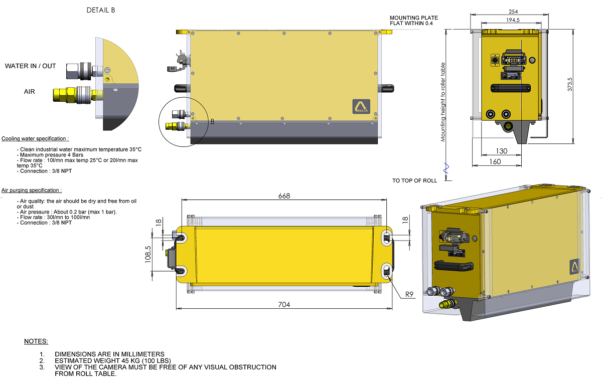 Note: The gauge may be subject to high ambient temperature and high infrared radiation from the hot strip. Water cooling should be kept in operation even if the gauge is not electrically connected. The maximum temperature of the gauge not operating is 70°C and operating 50°C (without water cooling).
