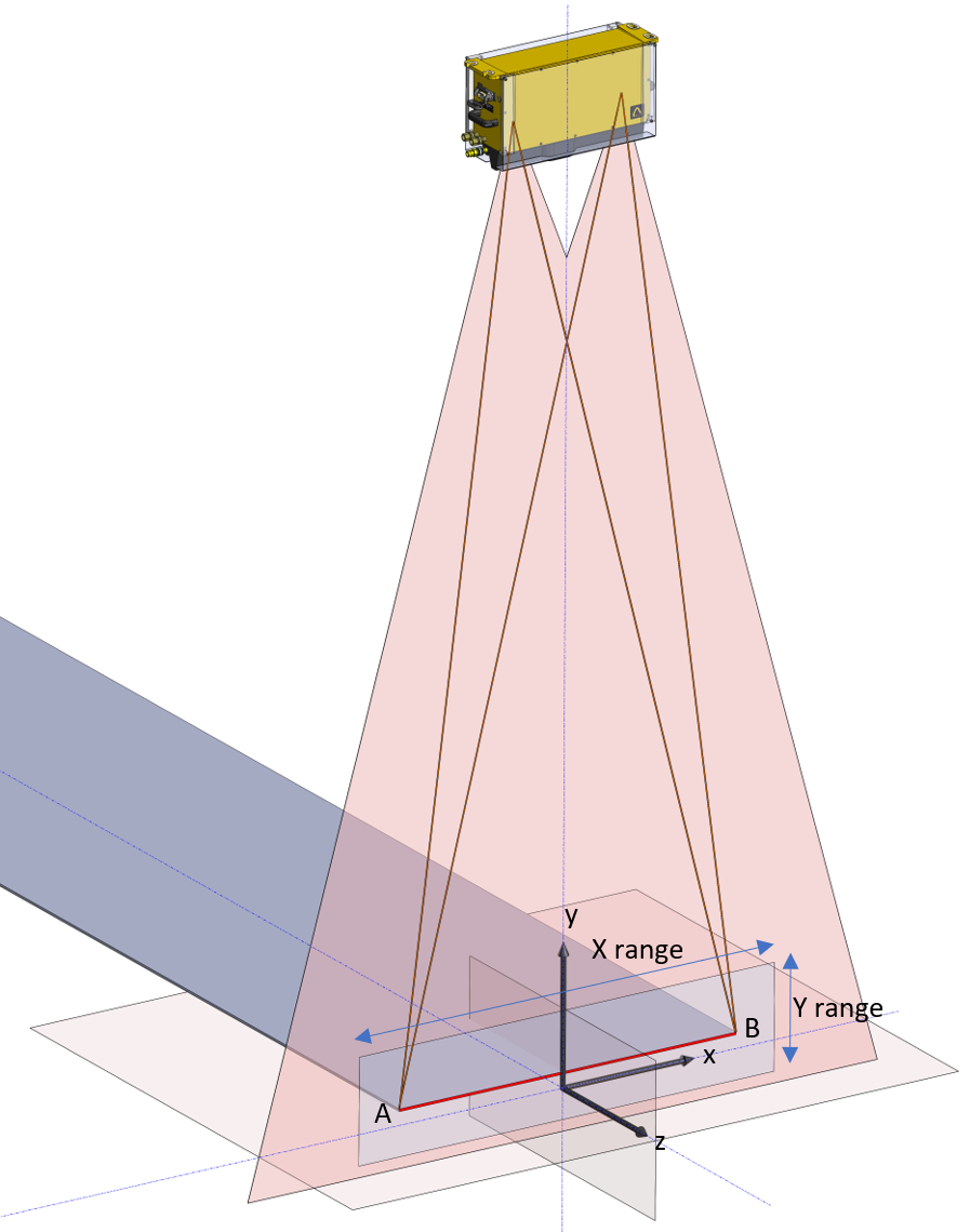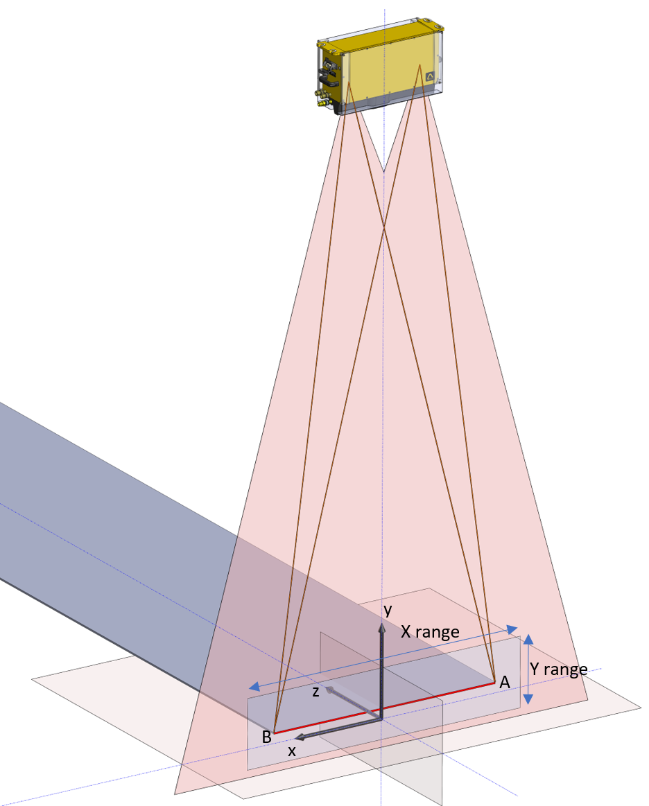 The Measurement Window establishes the valid measuring range of the gauge. The Gauge is calibrated at the factory for the specific dimensions of each installation. The Gauge coordinate system has its origin (0,0) a fixed distance from the back of the Gauge Camera Enclosure. This origin is determined during calibration of the gauge. The measurement window is a two dimensional area which defines valid measurements. Edges detected outside this window will be considered invalid and will not generate width measurements. Normally the total x-axis range is set just beyond the maximum possible product width for the particular application. The total y-axis range can be as much as about 20 inches (500 mm), but may be decreased if extreme environmental conditions (such as steam) interfere with proper Gauge operation. The measurement window is established by the following coordinates. Coordinate parameters are set in the Gauge setup menu. Window parameters are defined in the Diag screen.