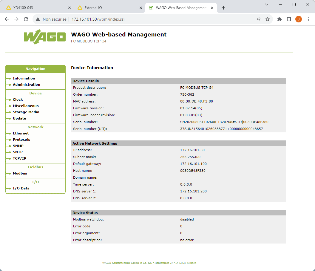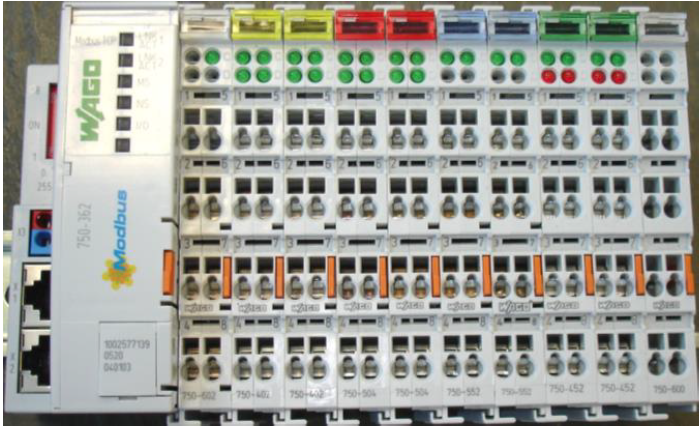 The external analogue and digital inputs and outputs are based on Wago Fieldbus Coupler with Modbus TCP protocol.