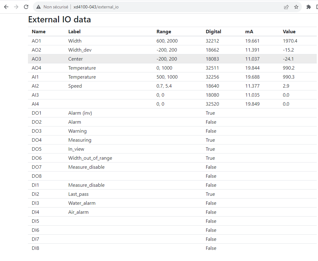 The configuration of the IOs is prepared before shipment and is described in the project file, and the datasheet of the IO modules are provided in the gauge documentation.