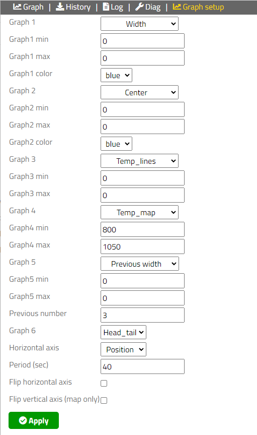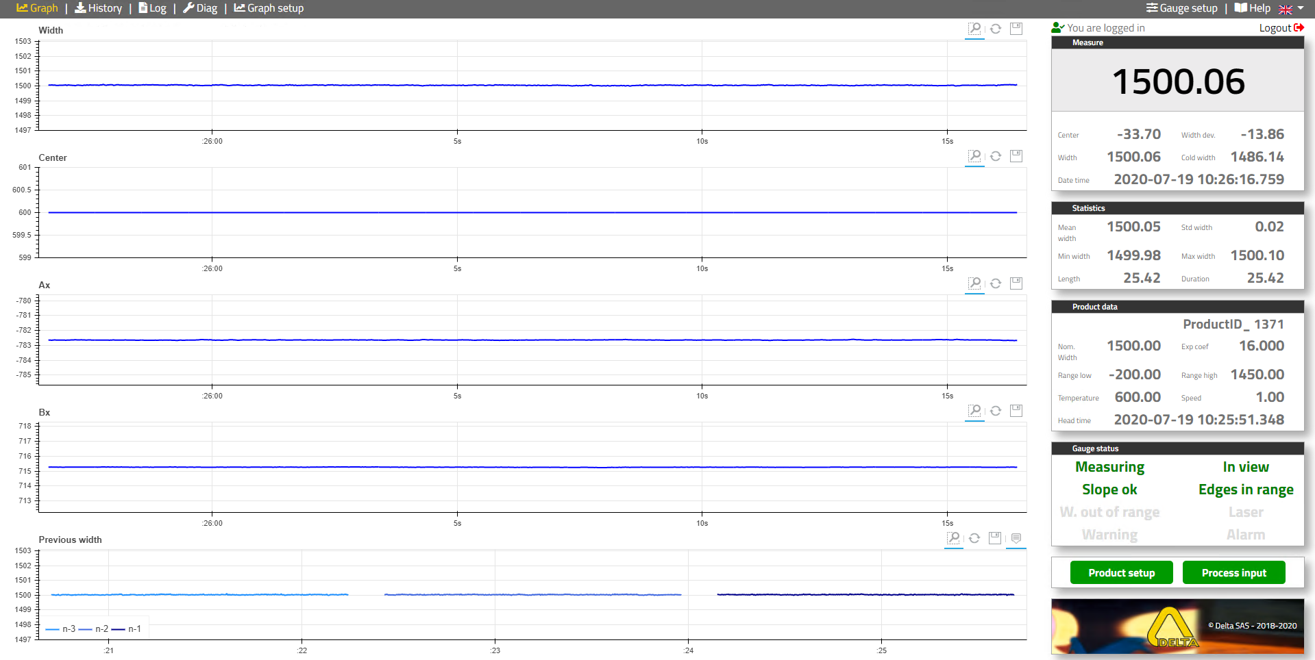 Display of 5 graphs. The user can select the following data: Width, Width deviation, Cold width (after contraction width at 20°C), Centre line, Edges position x and y, Strip speed, Strip temperature, Gauge internal temperature (Strip speed and temperature are optional and provided by user from a 4-20 mA input or from one of the network connection (Modbus TCP, OPCUA, field bus (option)).